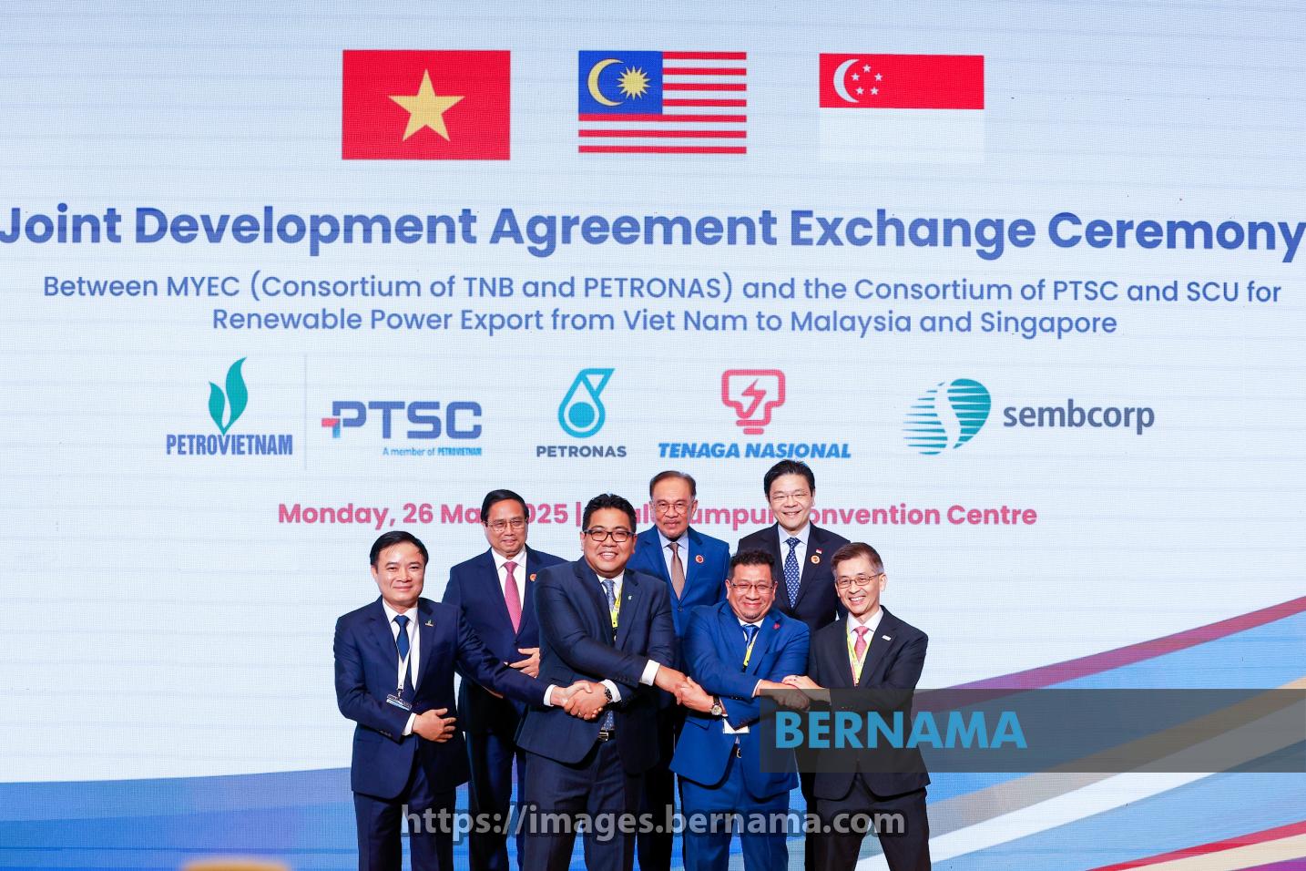 KUALA LUMPUR, May 26 -- Prime Minister Datuk Seri Anwar Ibrahim, Singaporean Prime Minister Lawrence Wong, and Vietnamese Prime Minister Phạm Minh Chính at the document exchange ceremony of a Joint Development Agreement on Renewable Integrated Sustainable Energy (RISE), involving PETRONAS and Tenaga Nasional Berhad (TNB) on the sidelines of the 46th ASEAN Summit at the Kuala Lumpur Convention Centre (KLCC) today.