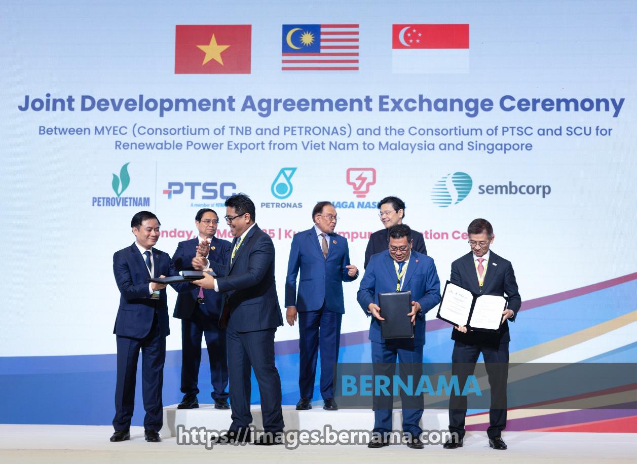 KUALA LUMPUR, May 26 -- Prime Minister Datuk Seri Anwar Ibrahim, Singaporean Prime Minister Lawrence Wong, and Vietnamese Prime Minister Phạm Minh Chính witness the document exchange ceremony of a Joint Development Agreement on Renewable Integrated Sustainable Energy (RISE), involving PETRONAS and Tenaga Nasional Berhad (TNB) on the sidelines of the 46th ASEAN Summit at the Kuala Lumpur Convention Centre (KLCC) today.