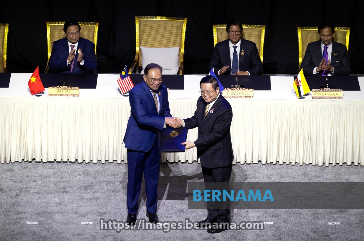 KUALA LUMPUR, May 26 -- Prime Minister Datuk Seri Anwar Ibrahim hands over the Kuala Lumpur Declaration on ASEAN 2045: Our Shared Future to ASEAN Secretary-General Dr. Kao Kim Hourn during the Signing Ceremony at the Plenary Hall, Kuala Lumpur Convention Centre (KLCC) today.