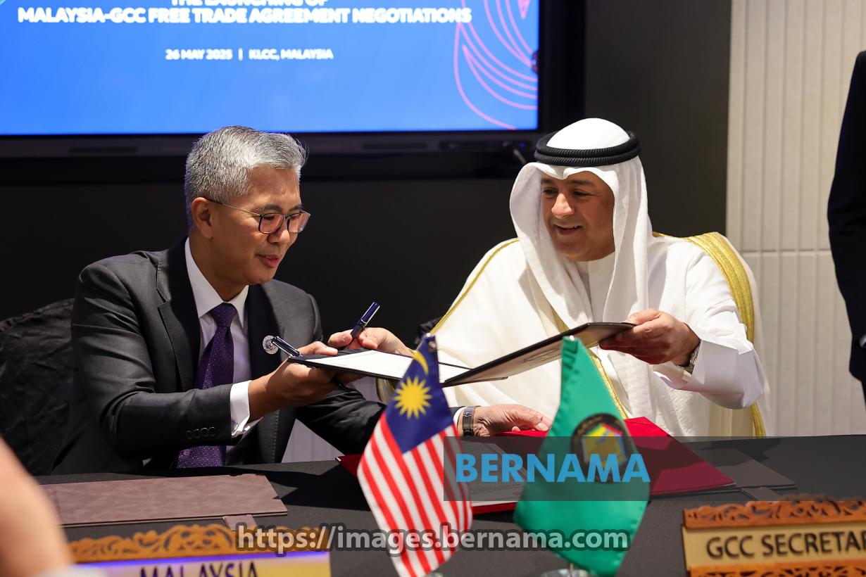 KUALA LUMPUR, May 26 — Investment, Trade and Industry Minister Tengku Datuk Seri Zafrul Abdul Aziz exchanges the Joint Statement with Gulf Cooperation Council (GCC) Secretary-General Jasem Mohamed AlBudaiwi during the Signing Ceremony on the Launching of Malaysia-GCC Free Trade Agreement Negotiations at the Kuala Lumpur Convention Centre today.