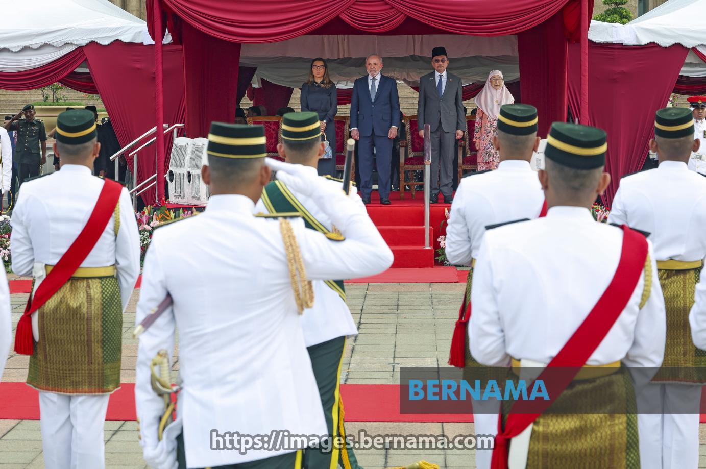 Lula, accompanied by his wife Janja Lula da Silva, is received by Prime Minister Datuk Seri Anwar Ibrahim and his wife Datuk Seri Dr Wan Azizah Wan Ismail.