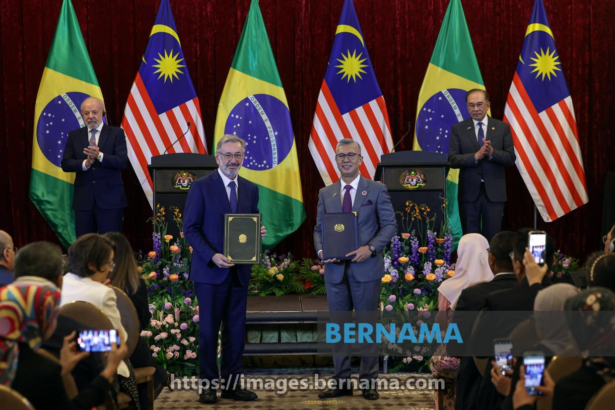 PUTRAJAYA, Oct 25 -- Prime Minister Datuk Seri Anwar Ibrahim (right) and Brazilian President Luiz Inácio Lula da Silva witness the exchange of a memorandum of understanding (MoU) between Investment, Trade and Industry Minister Tengku Datuk Seri Zafrul Abdul Aziz and Brazil's Vice Minister of Development, Industry, Trade and Services, Marcio Fernando Elias Rosa, at Seri Perdana Complex today.