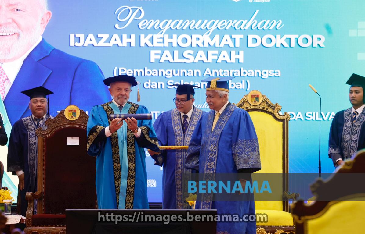 Lula, who is on a three-day official visit to Malaysia as the Guest of the Chair of ASEAN in conjunction with the 47th ASEAN Summit and Related Summits here, receives the doctorate from UKM Chancellor, the Yang di-Pertuan Besar of Negeri Sembilan Tuanku Muhriz Tuanku Munawir.