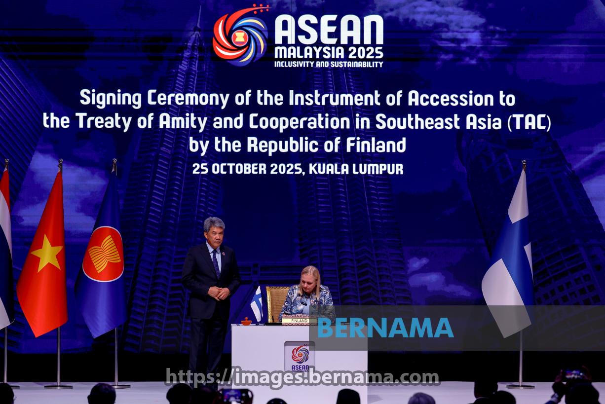 KUALA LUMPUR, Oct 25 -- Foreign Minister Datuk Seri Mohamad Hasan (left) and Finland' s Foreign Minister Elina Valtonen during the signing ceremony of the Instrument of Accession to the Treaty of Amity and Cooperation in Southeast Asia (TAC) by the Finland, on the sidelines of the 47th ASEAN Summit and related summits at the Kuala Lumpur Convention Centre (KLCC) today.