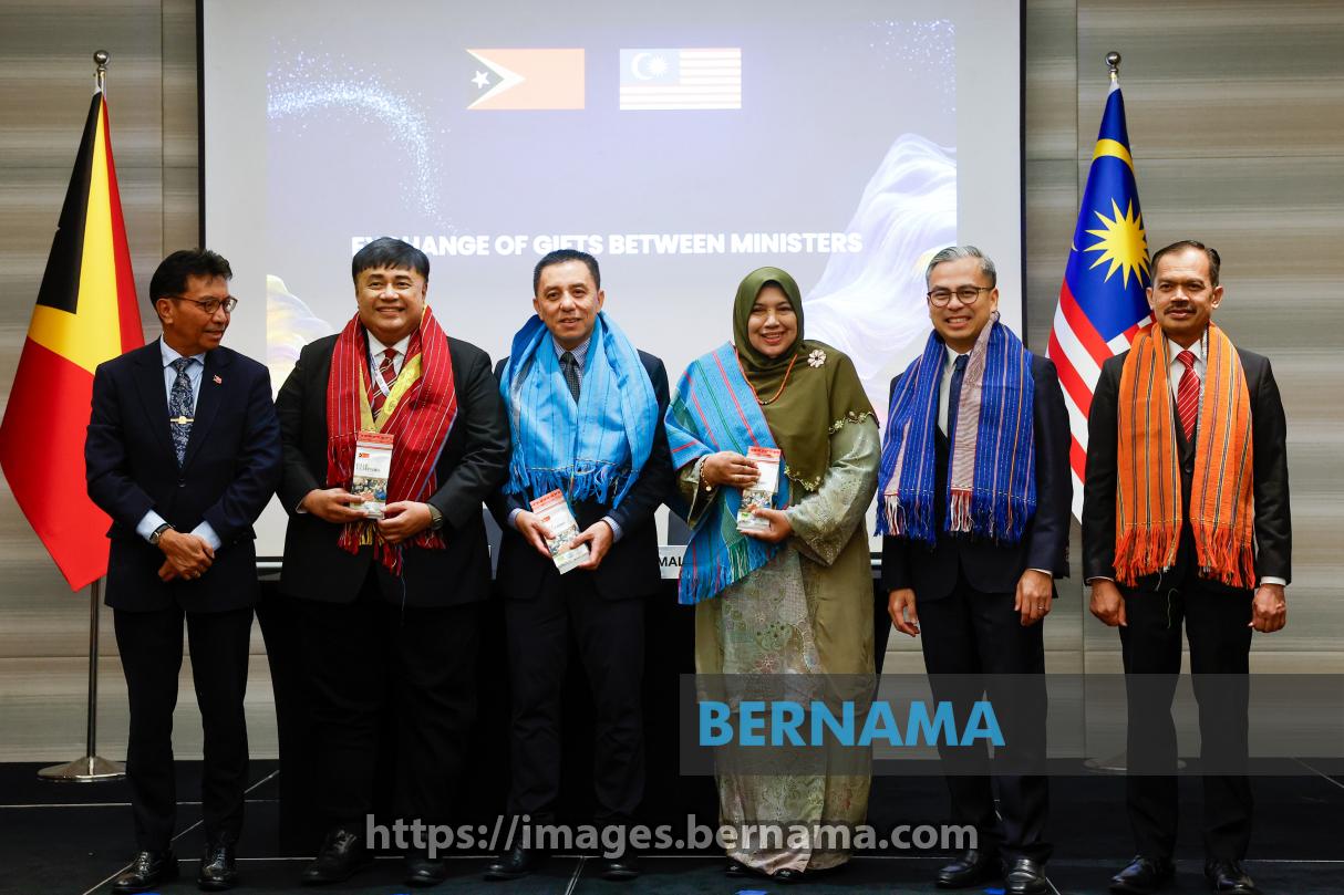 KUALA LUMPUR, Oct 25 -- Timor-Leste's Secretary of State for Social Communication Expedito Loro Dias Ximenes (left) poses for a photo with Communications Minister Datuk Fahmi Fadzil (second, right), Malaysian National News Agency (Bernama) chief executive officer Datin Paduka Nur-ul Afida Kamaludin and Communications Ministry secretary-general Datuk Seri Mohamad Fauzi Md Isa (right) after the signing ceremony of the Memorandum of Understanding (MoU) between Malaysia and Timor-Leste, tonight.