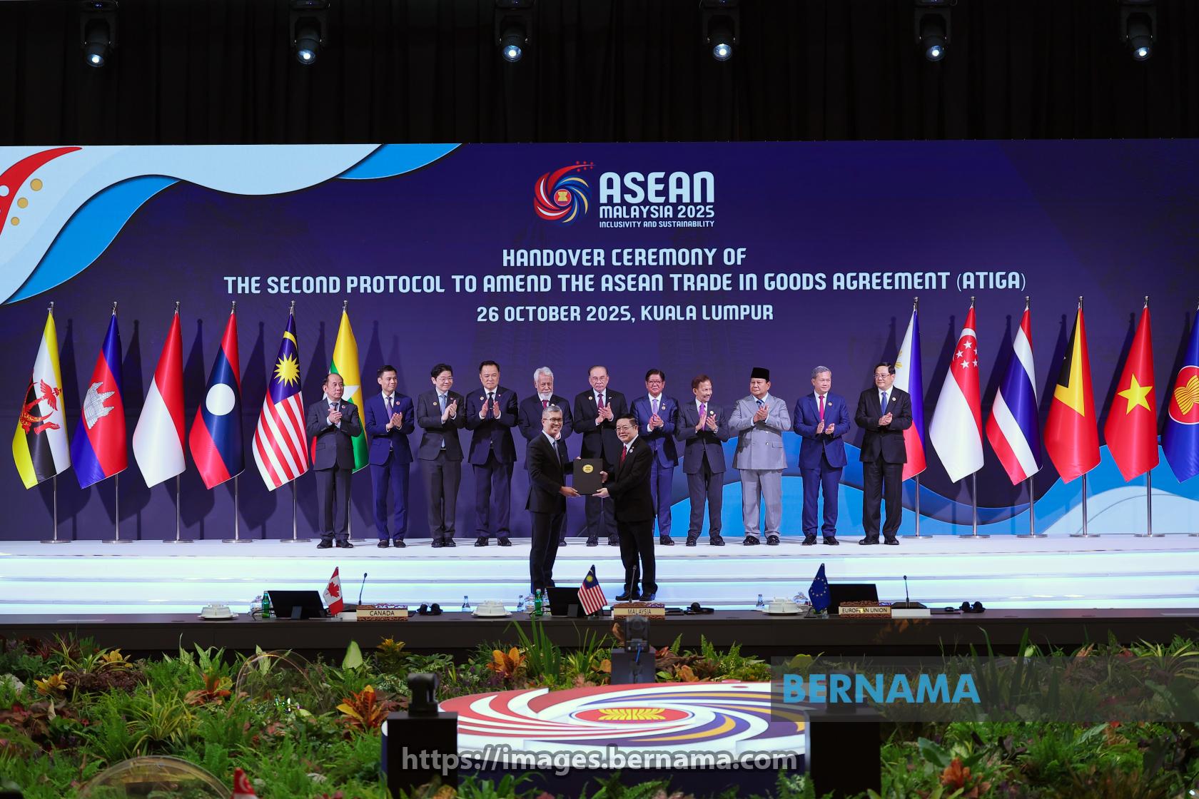 KUALA LUMPUR, Oct 26 -- Prime Minister Datuk Seri Anwar Ibrahim witnesses Investment, Trade and Industry Minister Tengku Datuk Seri Zafrul Abdul Aziz and ASEAN Secretary-General Dr. Kao Kim Hourn during the handover ceremony of the Second Protocol to Amend the ASEAN Trade in Goods Agreement (ATIGA) in conjunction with the 47th ASEAN Summit and Related Summits at the Kuala Lumpur Convention Centre today.