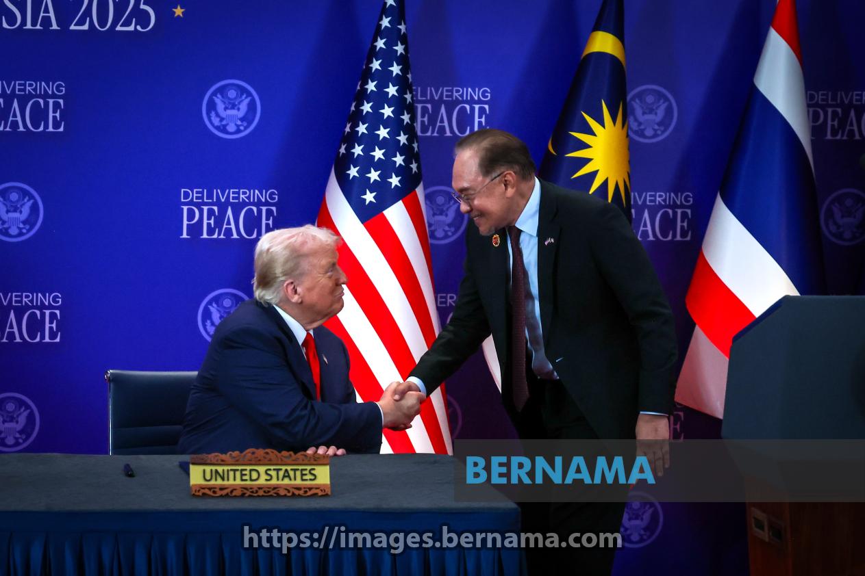 KUALA LUMPUR, Oct 26 -- United States President Donald Trump and Malaysian Prime Minister Datuk Seri Anwar Ibrahim (right) share an elated moment as they shake hands during the signing of the Cambodia–Thailand peace deal at the 47th ASEAN Summit at the Kuala Lumpur Convention Centre today.