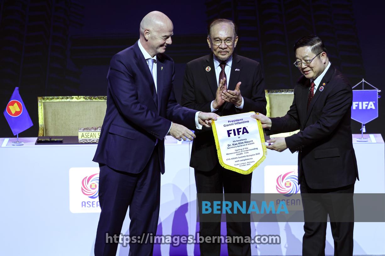 KUALA LUMPUR, Oct 26 — Prime Minister Datuk Seri Anwar Ibrahim witnesses FIFA President Gianni Infantino presenting a souvenir to ASEAN Secretary-General Dr Kao Kim Hourn (right) after the signing ceremony of the ASEAN–FIFA Memorandum of Understanding, on the sidelines of the 47th ASEAN Summit and Related Summits at the Kuala Lumpur Convention Centre (KLCC) today.