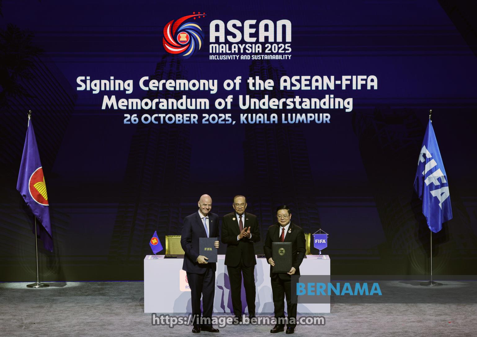 KUALA LUMPUR, Oct 26 — Prime Minister Datuk Seri Anwar Ibrahim witnesses the signing of the ASEAN–FIFA Memorandum of Understanding between ASEAN Secretary-General Dr Kao Kim Hourn and FIFA President Gianni Infantino on the sidelines of the 47th ASEAN Summit and Related Summits at the Kuala Lumpur Convention Centre (KLCC) today.