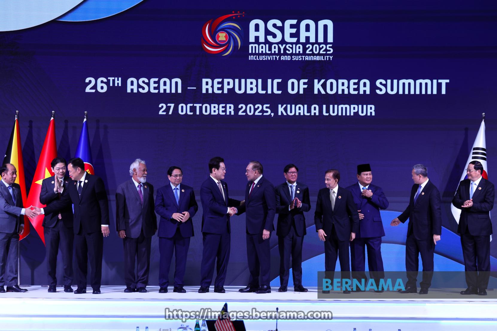 KUALA LUMPUR, Oct 27 -- Malaysian Prime Minister Datuk Seri Anwar Ibrahim (sixth, right) shakes hands with South Korean President Lee Jae Myung after joining ASEAN leaders for a group photo during the 26th ASEAN-Korea Summit at the Kuala Lumpur Convention Centre (KLCC) today.