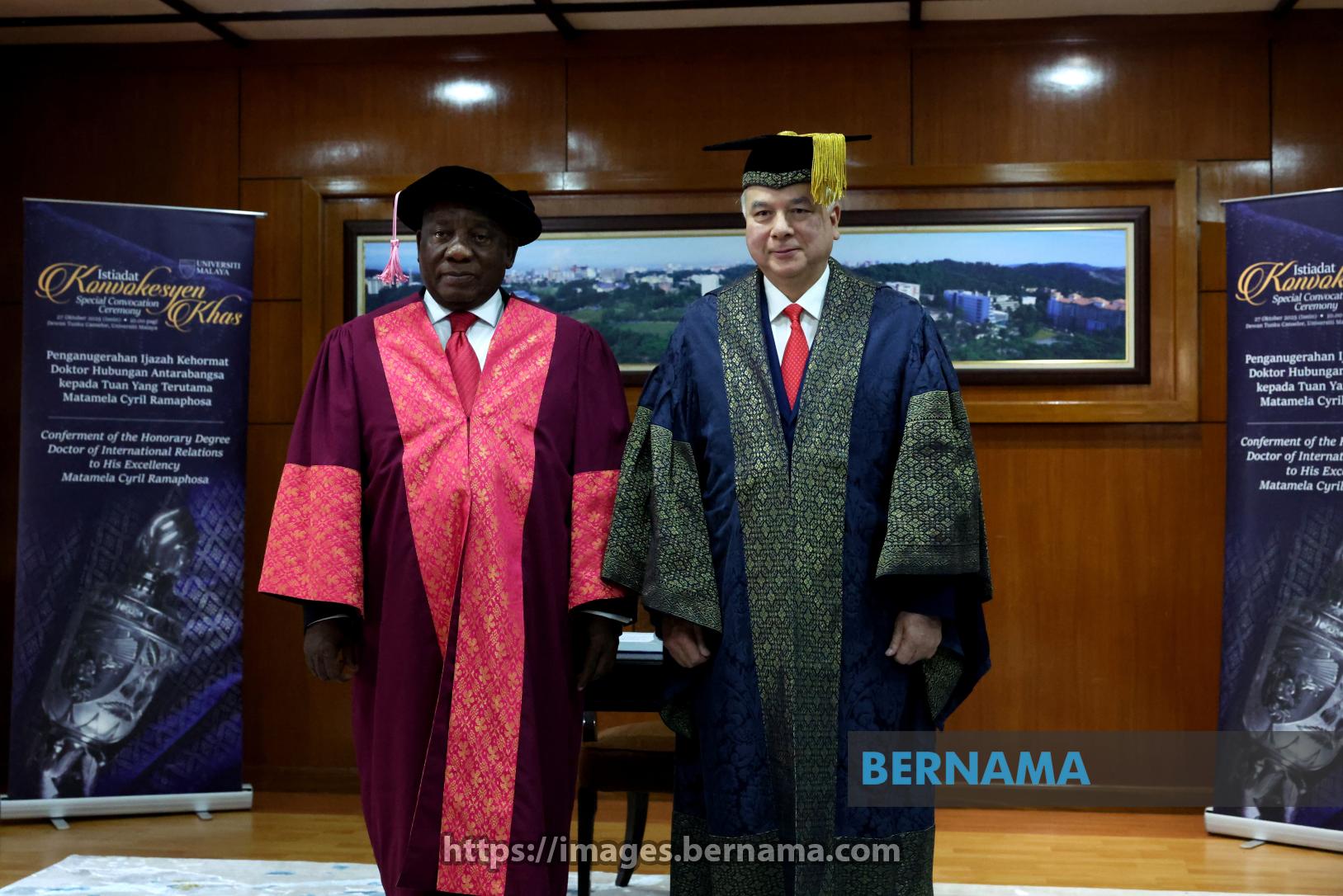 KUALA LUMPUR, Oct 27 -- Universiti Malaya (UM) Chancellor and Sultan of Perak, Sultan Nazrin Muizzudin Shah, and South African President Matamela Cyril Ramaphosa pose for a memorable photo at the UM Special Convocation Ceremony here today.