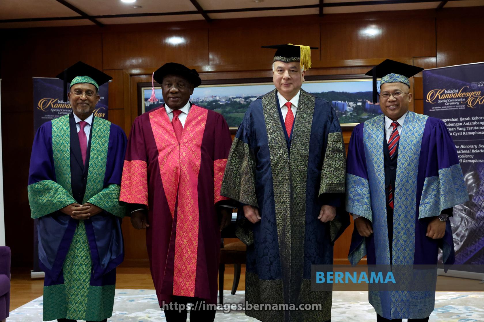 KUALA LUMPUR, Oct 27 -- Universiti Malaya (UM) Chancellor and Sultan of Perak, Sultan Nazrin Muizzudin Shah, and South African President Matamela Cyril Ramaphosa pose for a memorable photo at the UM Special Convocation Ceremony here today.