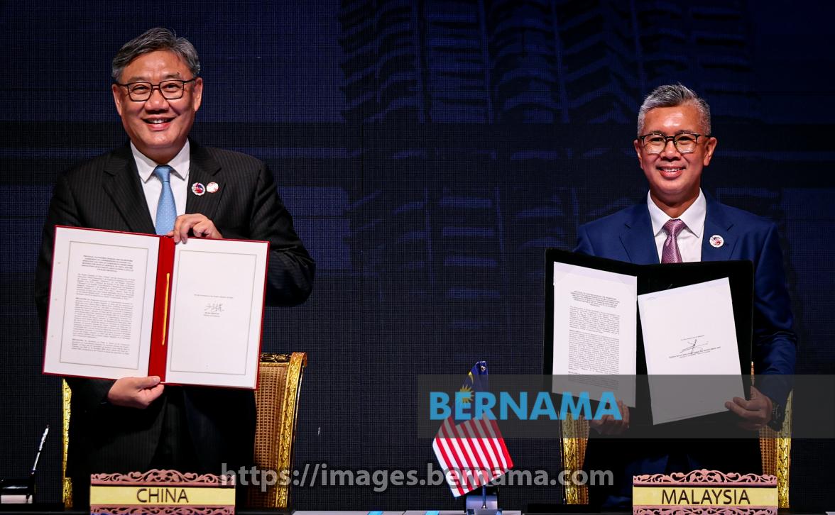 KUALA LUMPUR, Oct 28 -- Industry Minister Tengku Datuk Seri Zafrul Abdul Aziz and Chinese Minister of Commerce, Wang Wentao during the signing ceremony of the ASEAN-China Free Trade Area (ACFTA) 3.0 upgrade protocol in conjunction with the 47th ASEAN Summit and Related Summits at the Kuala Lumpur Convention Centre today.