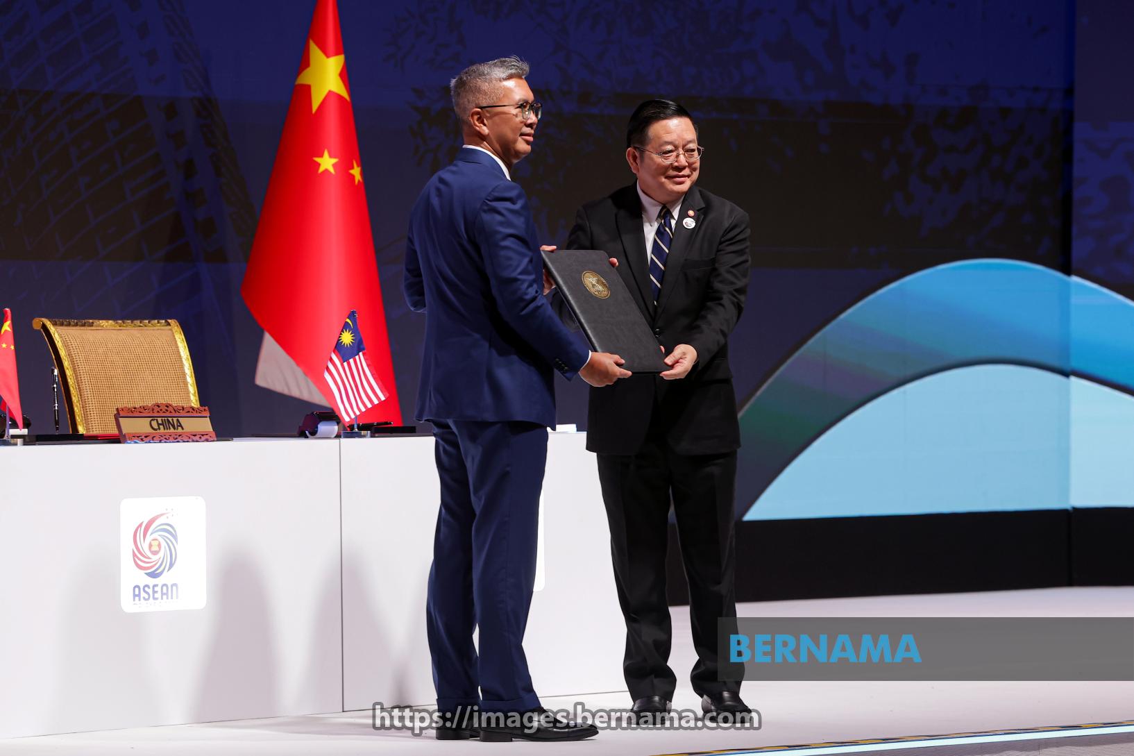KUALA LUMPUR, Oct 28 — Investment, Trade and Industry Minister Tengku Datuk Seri Zafrul Abdul Aziz (left) presents the ASEAN-China Free Trade Area (ACFTA) 3.0 to ASEAN Secretary-General Dr Kao Kim Hourn after its signing in conjunction with the 47th ASEAN Summit and Related Summits at the Kuala Lumpur Convention Centre today.
