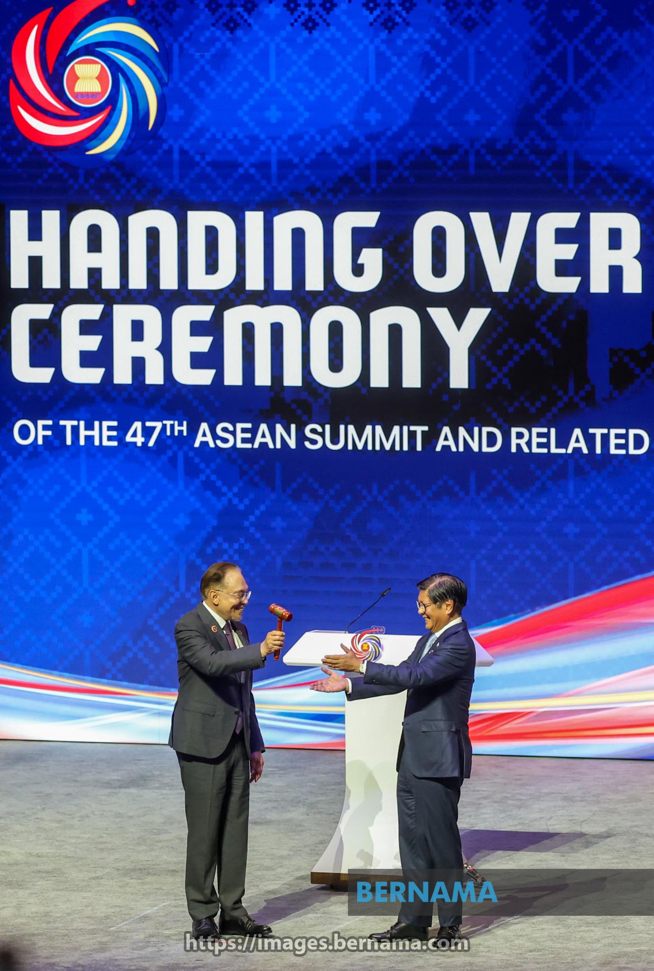 KUALA LUMPUR, Oct 28 — Prime Minister Datuk Seri Anwar Ibrahim hands over the ASEAN Chairmanship gavel to Philippine President Ferdinand R. Marcos Jr., symbolising the official transfer of leadership and setting the stage for the Philippines' stewardship in 2026.