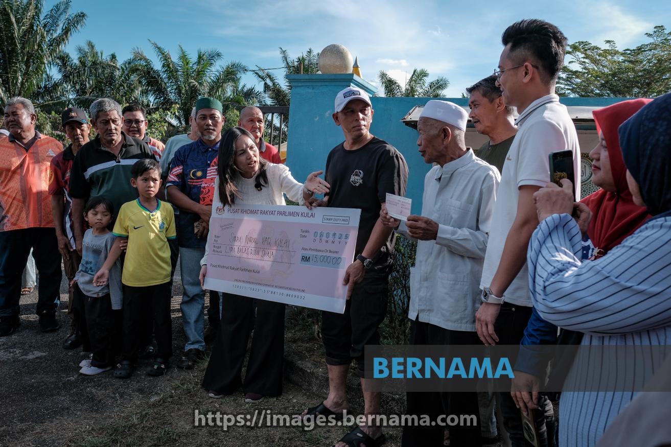 KULAI, 6 Sept -- Timbalan Menteri Komunikasi yang juga Ahli Parlimen Kulai Teo Nie Ching (tengah) menyampaikan replika cek bernilai RM15,000 kepada Pengerusi Surau Nurul Haq Kampung Sungai Sayong 1 Mohd Anuar Repan (lima, kanan), hari ini, susulan insiden van jenazah milik surau itu yang dicuri dan remuk teruk akibat kemalangan Khamis lepas.