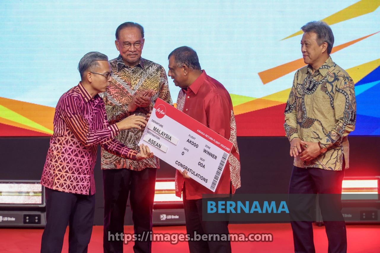 Pengasas bersama syarikat penerbangan tambang rendah merangkap Ketua Pegawai Eksekutif Capital A Bhd Tan Sri Tony Fernandes menyampaikan simbolik tawaran tersebut kepada Menteri Komunikasi, Datuk Fahmi Fadzil (kiri), sambil diperhatikan oleh Perdana Menteri, Datuk Seri Anwar Ibrahim, dan Pengerusi Pertubuhan Berita Nasional Malaysia (Bernama), Datuk Seri Wong Chun Wai (kanan).