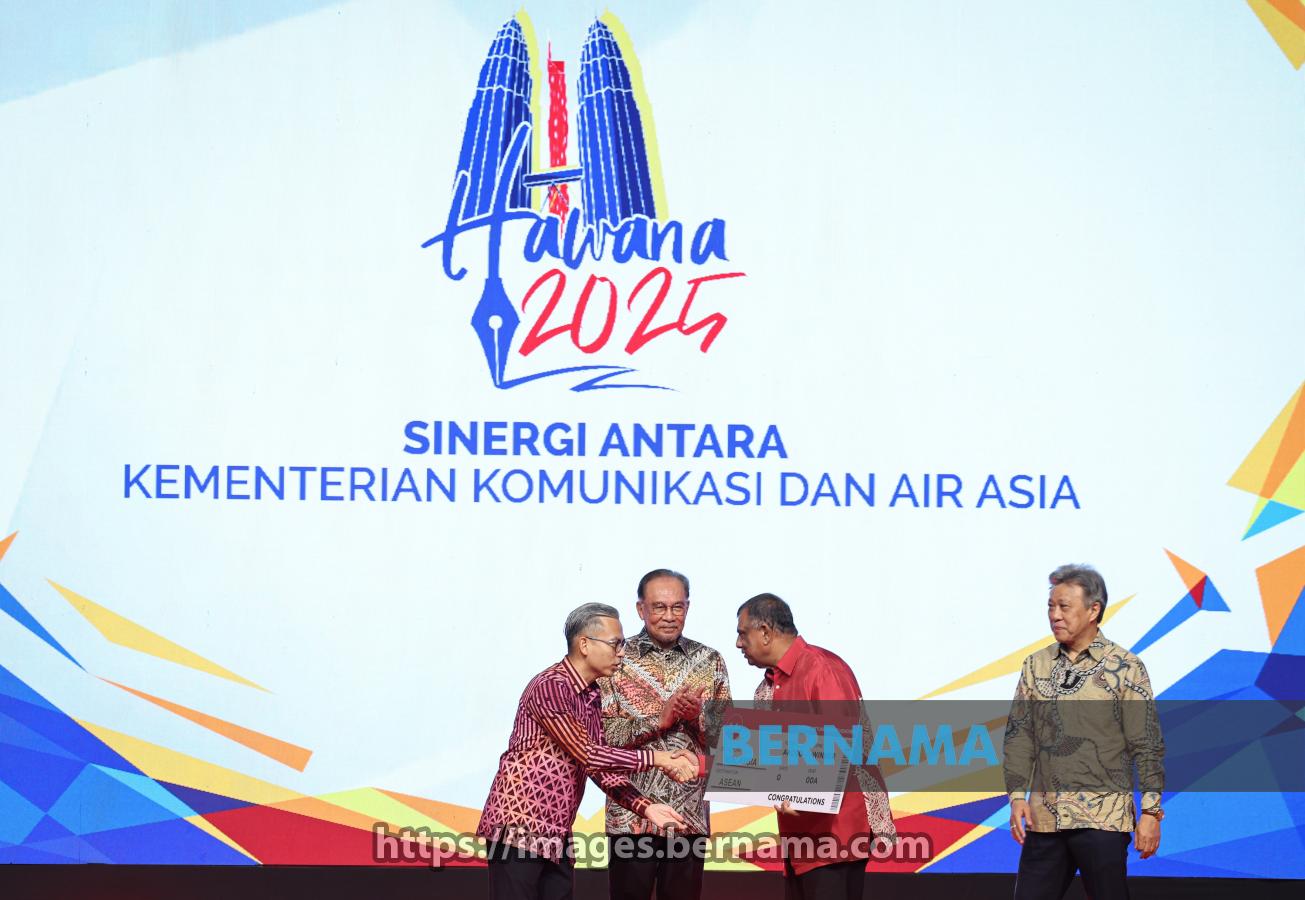 KUALA LUMPUR, 14 Jun -- Perdana Menteri Datuk Seri Anwar Ibrahim ketika menyaksikan sinergi antara Kementerian Komunikasi yang diwakili Menteri Komunikasi Datuk Fahmi Fadzil dan Air Asia yang diwakili Pengasas bersama syarikat penerbangan tambang rendah merangkap Ketua Pegawai Eksekutif Capital A Bhd, Tan Sri Tony Fernandes (tiga, kiri) pada majlis kemuncak Hari Wartawan Nasional (HAWANA) 2025 di Dewan Merdeka, Pusat Dagangan Dunia Kuala Lumpur (WTCKL) hari ini.