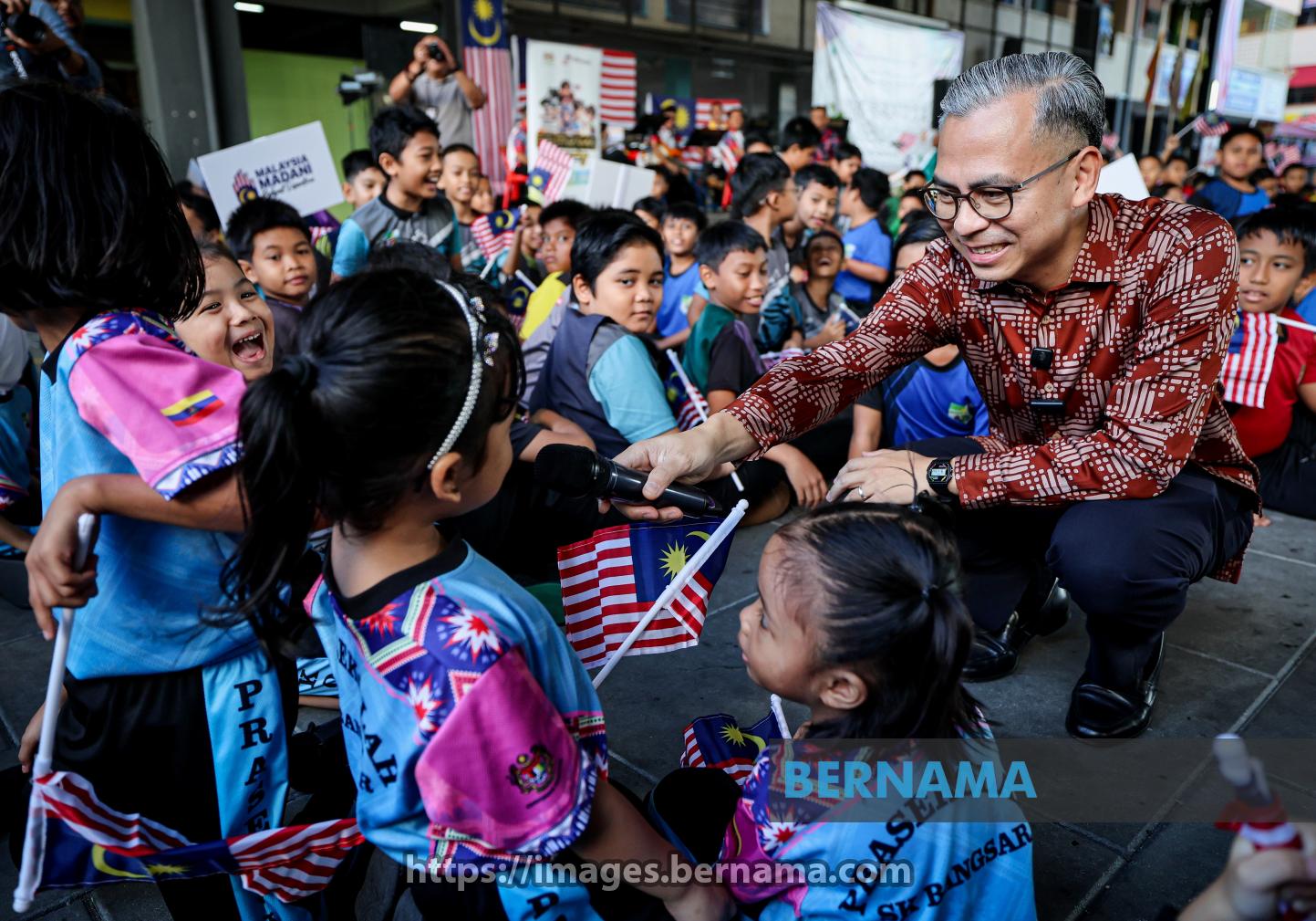 KUALA LUMPUR, 7 Ogos -- Menteri Komunikasi Datuk Fahmi Fadzil beramah mesra dengan murid-murid dalam sembang santai pada Program Pentarama Homecoming di Sekolah Kebangsaan Bangsar hari ini.
