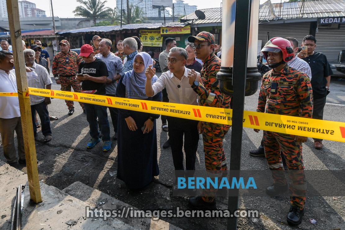 KUALA LUMPUR, 8 Ogos -- Menteri Komunikasi yang juga Ahli Parlimen Lembah Pantai, Datuk Fahmi Fadzil (tiga, kanan) mendengar taklimat daripada Ketua Balai Bomba dan Penyelamat Jalan Pantai Baharu, Wan Mohd Shahrir Azizi Wan Said (dua, kanan) ketika melawat lokasi kebakaran yang menyebabkan beberapa buah lot kedai dan rumah di Pantai Dalam terbakar dalam kejadian malam tadi.