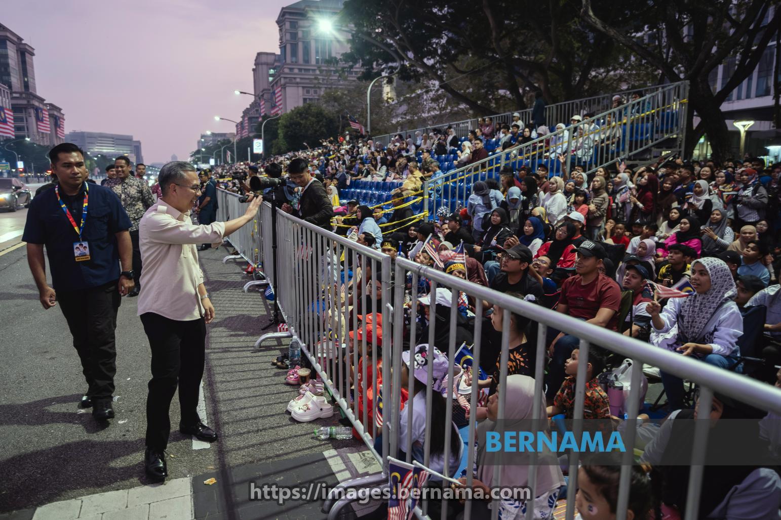 PUTRAJAYA, 31 Ogos -- Menteri Komunikasi Datuk Fahmi Fadzil (dua, kiri) menyantuni pengunjung yang hadir seawal 4 pagi bagi menyaksikan sambutan Hari Kebangsaan 2025 di Dataran Putrajaya, hari ini.