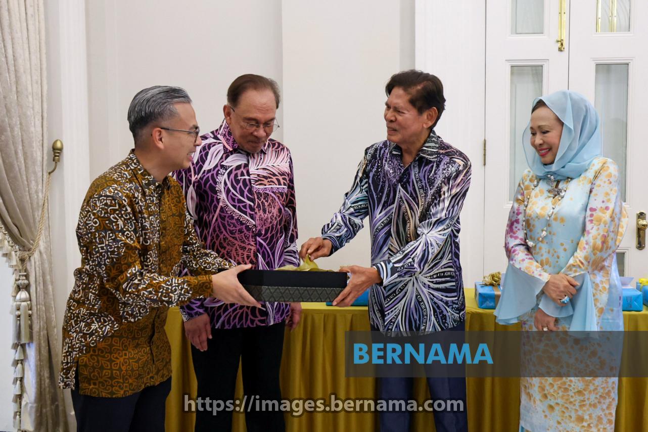 GEORGETOWN, 16 Sept -- Yang Dipertua Negeri Pulau Pinang Tun Ramli Ngah Talib menerima cenderahati daripada Menteri Komunikasi, Datuk Fahmi Fadzil (kiri) sambil disaksikan oleh Perdana Menteri, Datuk Seri Anwar Ibrahim ketika menerima kunjungan hormat di Seri Mutiara hari ini.