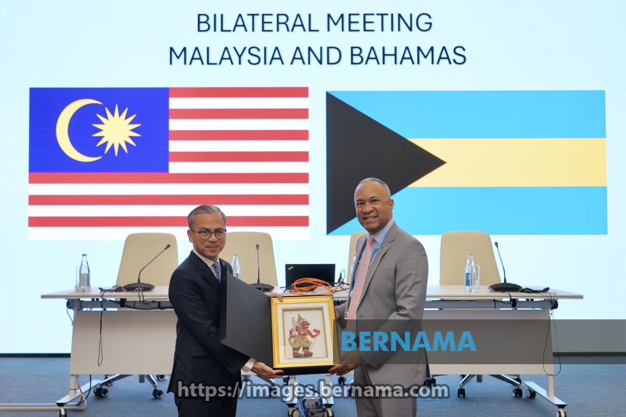 BAKU (Azerbaijan), Nov 19 – Communications Minister Datuk Fahmi Fadzil presents a souvenir after holding a bilateral meeting with ITU's Chief of Administration and Finance, Stepen Bereaux, who is also the Bahamas candidate for the post of ITU Deputy Secretary-General, at the 2025 World Telecommunication Development Conference (WTDC-25) at the Baku Convention Centre on Nov 18.